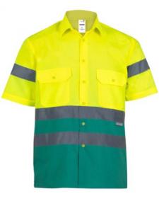 Camisa bicolor de alta visibilidad de manga corta. Cintas reflectantes en torso y mangas, abertura central con botones, cuello camisero y dos bolsillos de pecho con tapeta y botón.