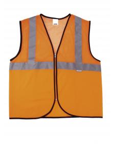 Chaleco de malla de alta visibilidad con tejido de rejilla en la parte superior, cremallera central y cintas reflectantes en el pecho y hombros.