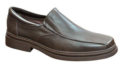 Zapato con cierre de elásticos laterales, de piel napa flor, forrada en la pala con piel de porcino, acolchado en el tobillo para evitar rozaduras. Horma recta de puntera redondeada. Contrafuerte de dureza suficiente para sujetar el calcáneo. Plantilla acolchada de piel sobre espuma de poliuretano termoconformado con tratamiento antibacterias y carbón activado.