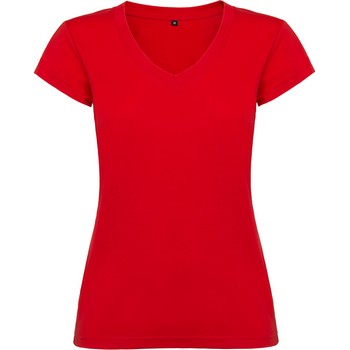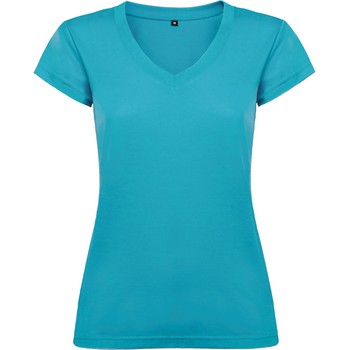Camiseta de manga corta de mujer con escote en cuello de pico y acabados en ribete acanalado. Corte entallado con costuras laterales.