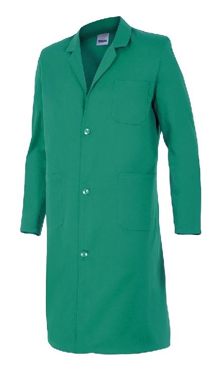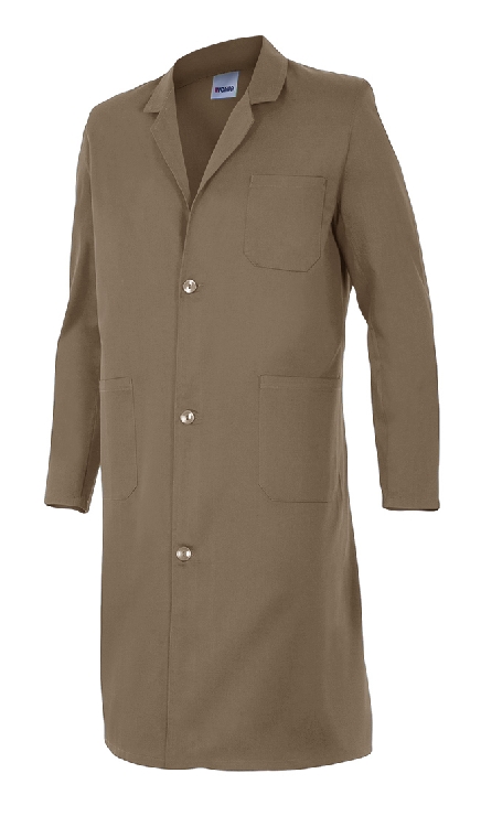 Bata con cierre central con botones, tres bolsillos de parche y cinturón en la espalda.